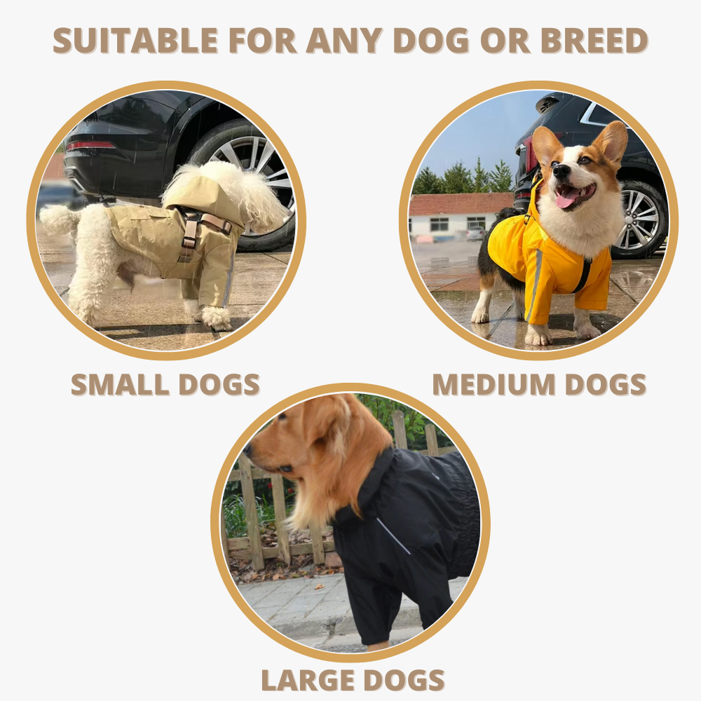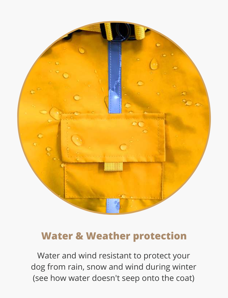 This rain coat offer a full weather protection. It is wind and water resistant so your dog will stay dry all day long, no matter the weather outside thanks to its full water resistance and waterproof surface. The jacket covers your dog's paws, entire body and belly as well.
