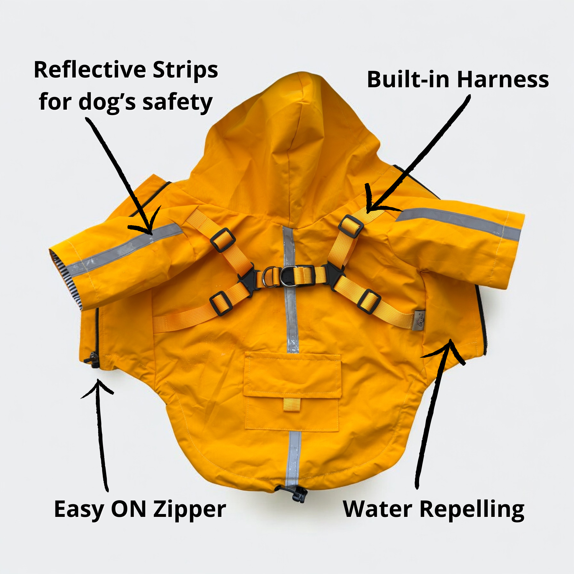 Heading out in the cold with your furry pal? Don't mess around layering multiple items on your dog, or threading harnesses through coat holes. With our rain coat you can ZIP, CLIP, and GO!